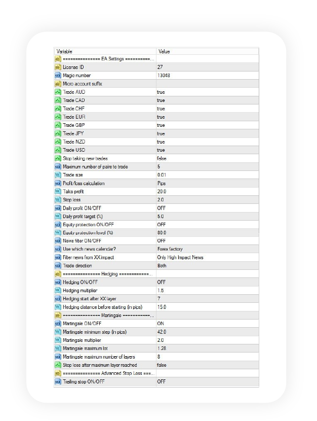 Comprehensive setting to adjust martingale. Off it if you prefer to trade with TP/SL.